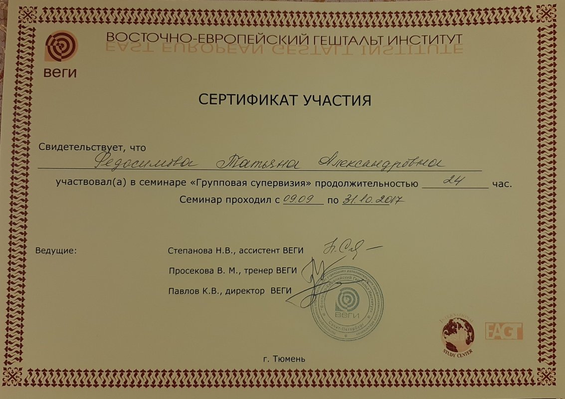 В настоящее время обучаюсь по программе "Супервизия в гештальт-терапии", посещаю интервизорские и супервизорские группы, а так же часы своей личной терапии (что необходимо в работе специалиста).
